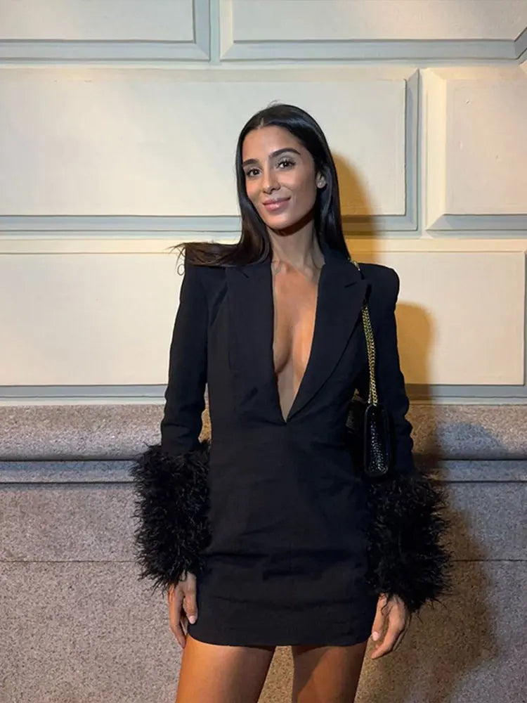 Micaela| Black Deep V-neck Fringed Blazer Dress